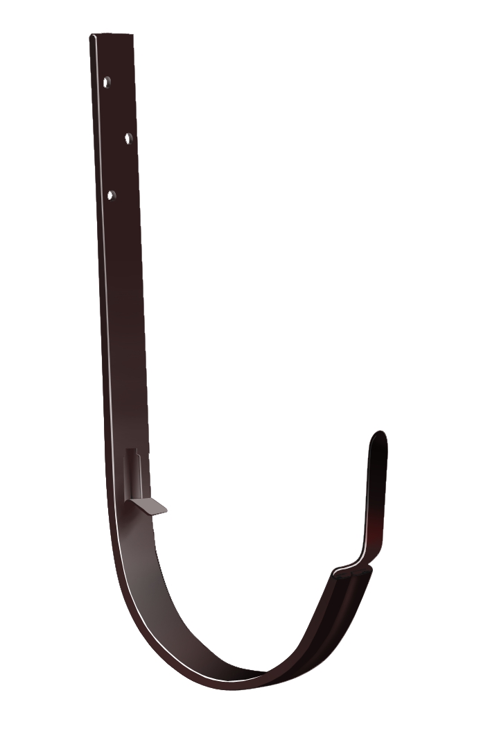 Крюк крепления желоба - металлический элемент пластиковой водосточной системы ТЕХНОНИКОЛЬ. Выполнен из оцинкованной стали с цветным полимерным покрытием. Предназначен для крепления желоба к лобовой доске с учетом заданного уклона.