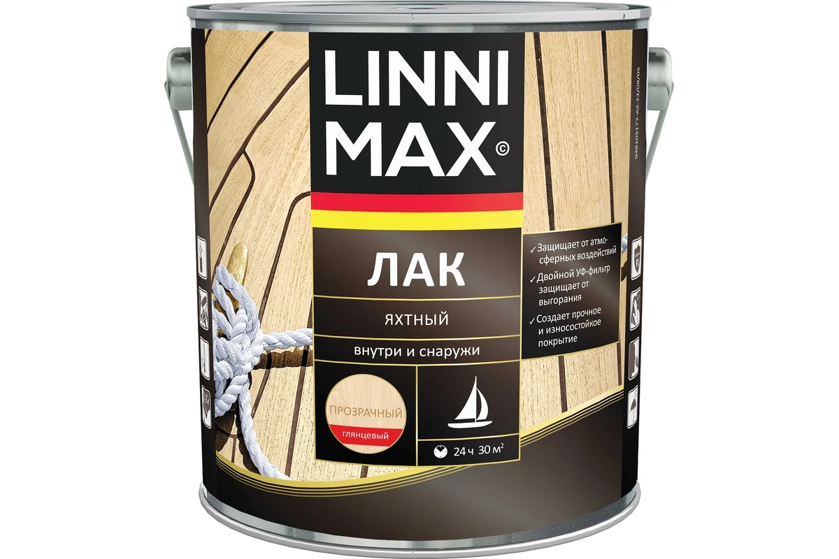 LINNIMAX Лак яхтный - прозрачный запечатывающий лак на алкидно-полиуретановой основе для создания устойчивого защитного покрытия подвергаемых особо сильной водной нагрузке деревянных поверхностей снаружи и внутри помещения.Водостойкий: обладает устойчивостью к динамической нагрузке к пресной и солёной воде.
